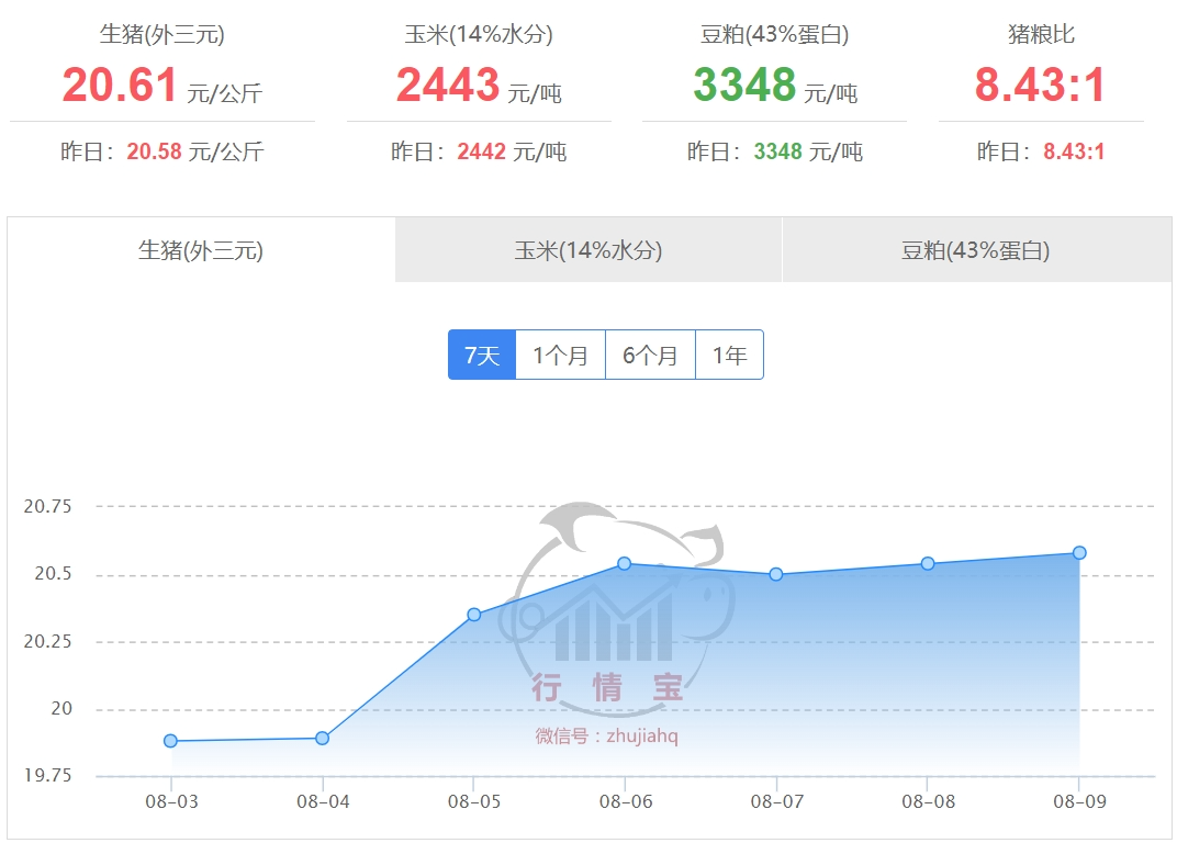 注:“红色字体示意涨或平、绿色字体示意跌”,数据开始于行情宝,生猪的价钱为“元/kg”,玉米、豆粕价钱单元为“元/t”,此价钱为生猪成交价钱,仅供参考。