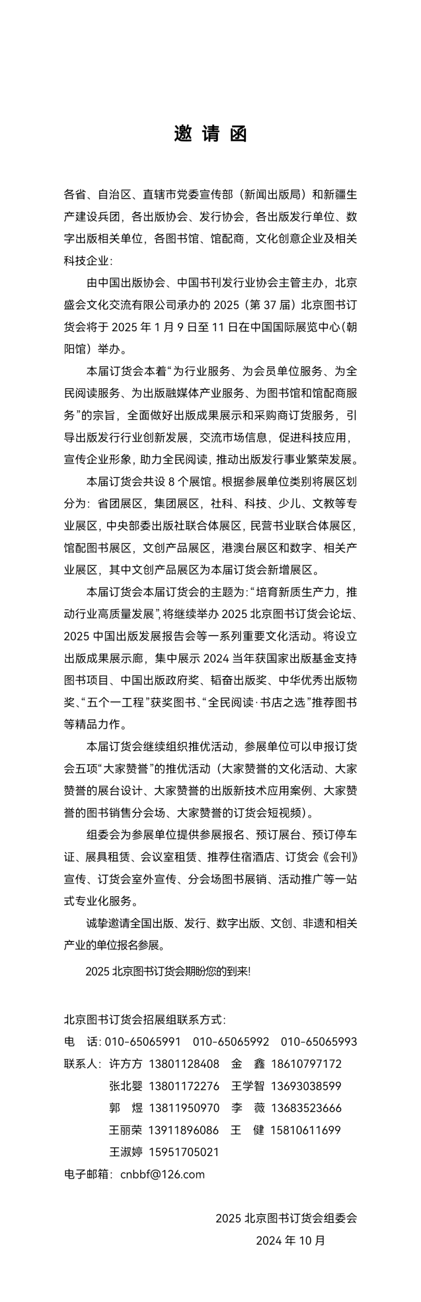 记者日前从2025北京史籍订货会组委会获悉,由中国出书协会、中国书刊刊行业协会哄骗驾御,北京嘉会文化疏通有限公司经办的2025(第37届)北京史籍订货会将于2025年1月9日至11日在中国海外展览中心(向阳馆)举办。